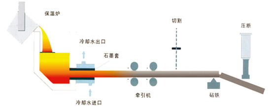 水平連鑄鑄鐵型材的制作方法是將嚴格選擇的原輔料經沖天爐或感應爐熔化處理后的鐵水,倒入保溫爐內,鐵水流入安裝在保溫爐下方的水冷石墨結晶器中,凝結成一定溫度的外殼,被牽引機拉拔成型材。保溫爐內的熔融鐵水, 在牽引機拉拔的同時,又不斷地補充倒結晶器內冷卻凝固,形成了一個動態的大胃口補縮小鑄件的工藝模式,保證了所產棒坯致密,無內部缺陷。不同形狀的結晶和不同的生產工藝,可以生產不同截面,不同材質的鑄鐵型材。